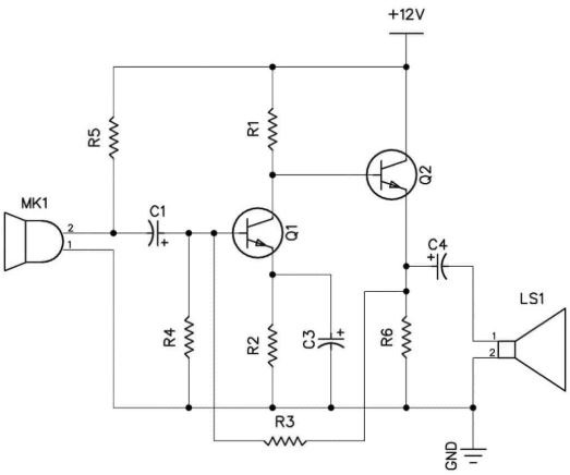 ส่วนประกอบเดียวที่จะเปลี่ยนไปคือ R3 และ C4; C2 ถูกแทนที่ด้วย C4 หากไม่มี C4 จะเกิดการชดเชยกระแสตรง (DC offset) ที่ลำโพง เราจำเป็นต้องทราบค่าความต้านทานของโหลด นั่นคือลำโพง วงจรอย่างง่ายนี้ไม่สามารถขับลำโพง 8Ω ได้ คุณจะต้องใช้เครื่องขยายเสียงสำหรับลำโพงขนาดนั้น สมมติว่าเราใช้หูฟังโทรศัพท์มือถือที่มีค่าความต้านทานประมาณ 100Ω สำหรับแรงดันไฟตกคร่อม 12V จะใช้กำลังไฟประมาณ 1W ซึ่งเกินกำลังของวงจรอย่างง่ายนี้ กำลังไฟกระแสตรงคงที่ของตัวตามตัวส่งสัญญาณ (emitter follower) ควรเท่ากับกำลังไฟนั้นเพื่อให้ได้กระแส 100mA ในทรานซิสเตอร์ ซึ่งเกินกำลังของมันมาก เราจะลดความคาดหวังลงและอนุญาตให้กระแสสูงสุดใน Q2 อยู่ที่ 10mA เนื่องจากแรงดันไฟตกคร่อมตัวส่งสัญญาณของ Q2 คือ 6-0.6V = 5.4V ดังนั้น R6 = 5.4/0.01 = 540 เรียกได้ว่าเป็น 560Ω ตอนนี้ R3 ไม่ได้ต่อกับ 12V แล้ว แต่ต่อกับ 6V ค่าของมันจึงกลายเป็น (6-1.5)/0.03 = 150K ส่วน C4 มีค่าเท่ากับ 1/2π40*100 = 25uF