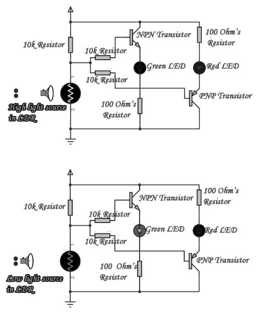 ชิ้นส่วนที่จําเป็น: LDR, ตัวต้านทาน 10K(3), แหล่งจ่ายไฟ DC 5V, ตัวต้านทาน 100 โอห์ม(2), LED สีเขียว, LED สีแดง, ทรานซิสเตอร์ PNP, ทรานซิสเตอร์ NPN
