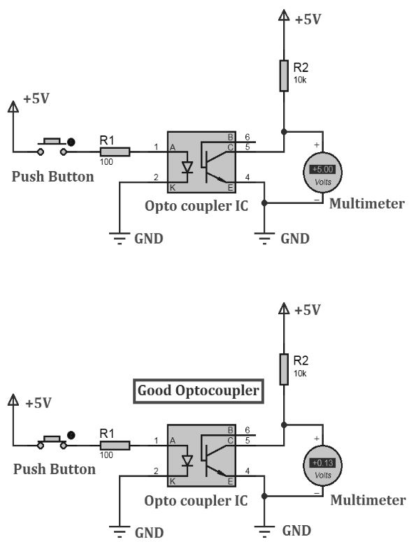 หากกดปุ่ม: แสดงปริมาตร tag การอ่านค่า e อยู่ใกล้ 0V หรือ 0.2V DC มิฉะนั้นปุ่มกดจะยกเลิกการกด: แสดงปริมาตร tag การอ่าน e อยู่ใกล้ 5V หรือ 4.9V DC Optocoupler IC เป็นสิ่งที่ดี มิฉะนั้นถ้า Optocoupler IC ไม่ดี