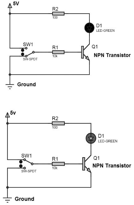 หากกดปุ่มด้านจ่าย ทรานซิสเตอร์จะ ปิด และไฟ LED จะ ดับลง มิฉะนั้นกดปุ่มด้านกราวด์ ทรานซิสเตอร์จะ เปิด ขึ้นและไฟ LED จะ เปิด ขึ้น มันทํางานได้อย่างถูกต้องทรา นซิสเตอร์เป็นสิ่งที่ดี มันไม่ทํางานทรา นซิสเตอร์ไม่ดี