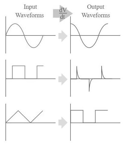 เนื่องจากวงจรดิฟเฟอเรนเซอร์มีเอาต์พุตที่เป็นสัดส่วนกับการเปลี่ยนแปลงอินพุตรูปคลื่นมาตรฐานบางตัวเช่นคลื่นไซน์คลื่นสี่เหลี่ยมและคลื่นสามเหลี่ยมให้รูปคลื่นที่แตกต่างกันมากที่เอาต์พุตของวงจรดิฟเฟอเรนเซอร์