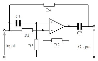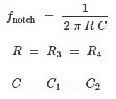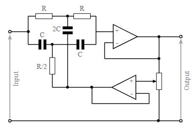 วงจรนี้มักใช้เพื่อขจัดเสียงฮัมที่ไม่ต้องการออกจากวงจร ค่าสําหรับรอยบาก 50 Hz จะเป็น: ตัวเก็บประจุ: C1, C2 = 47 nF, ตัวต้านทาน: R1, R2 = 10 k, R3, R4 = 68 k